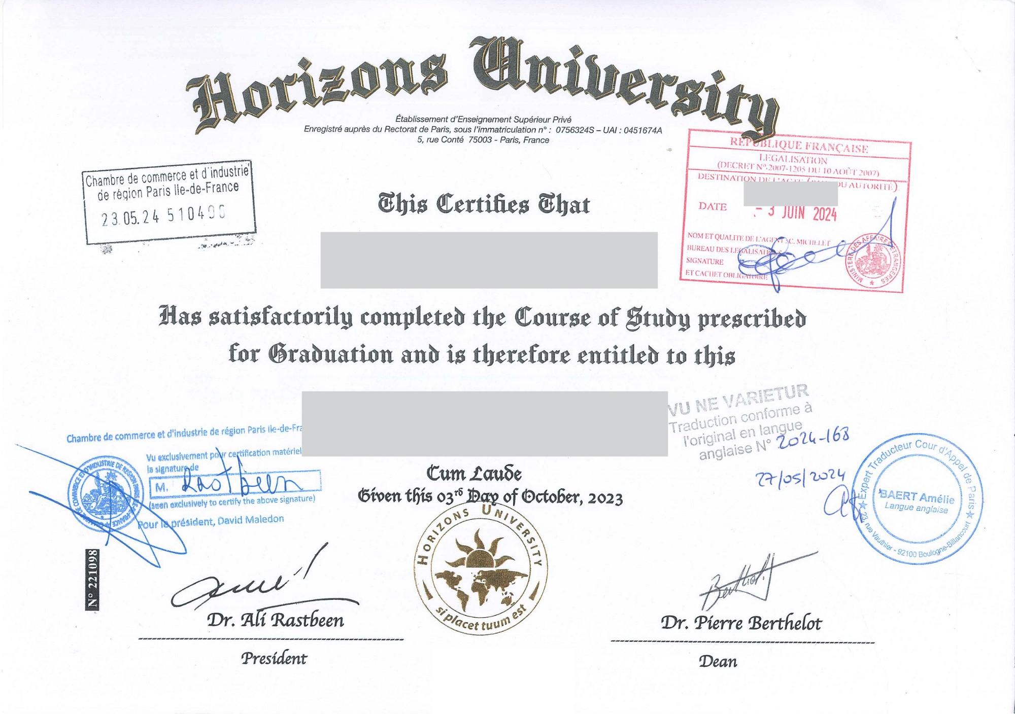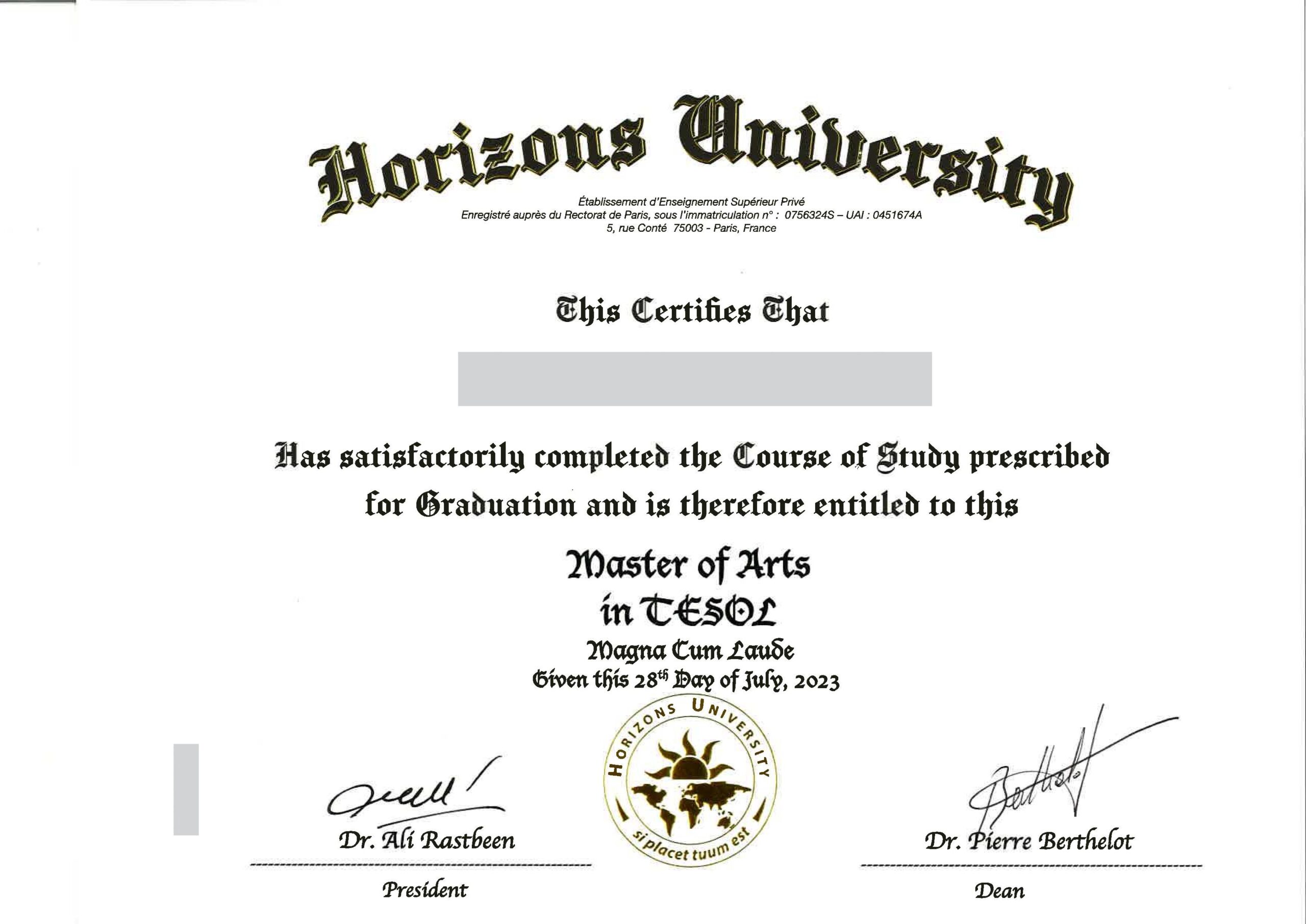 Master of Arts in TESOL from Horizons University, France